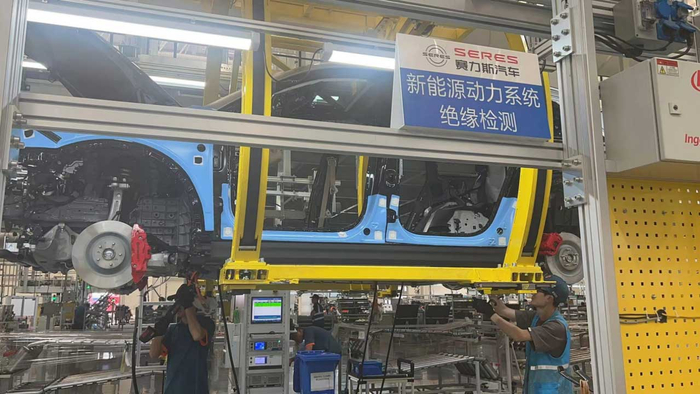 作为新能源汽车,“安全”是赛力斯最为注重的一项指标。在底盘、电池装配完成后,生产线上的车辆会进入“新能源动力系统绝缘检测台”,通过人工检查是否会出现动力电池装配工艺欠缺、是否会出现漏电的情况,将风险降至最低。