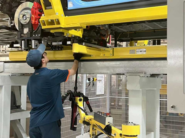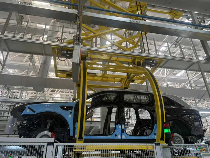 赛力斯的总装线是“人、机混装操作”,即部分工段由工人进行装配,而一些关键总成部分则是通过大型智能设备完成自动装配。其中,总装最关键的工位——底盘与车身合装工位,采用“智能全自动整体合装”。