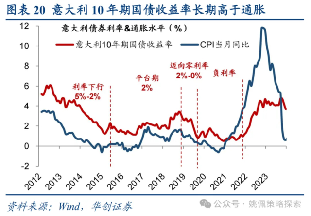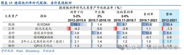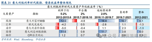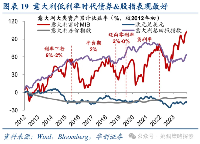 3、低利率时代的资产价格表现:日本-国债>汇率>物价>存款>股指>房价,债券规模扩张、股票先降后升、地产降;欧洲-股票>地产>存款≈公债≈物价>汇率,德国股指&房价亮眼,法国股指较强、房价&债券小幅跑赢通胀,意大利股指表现稍逊,债券回报可观。