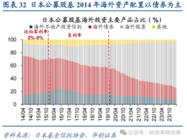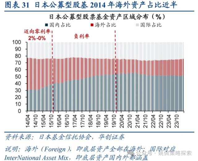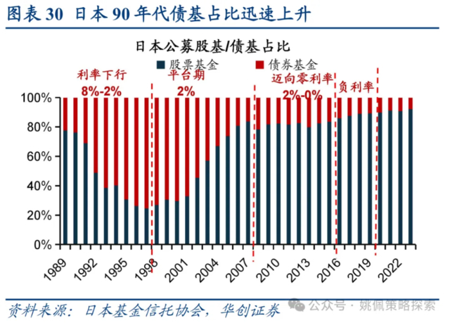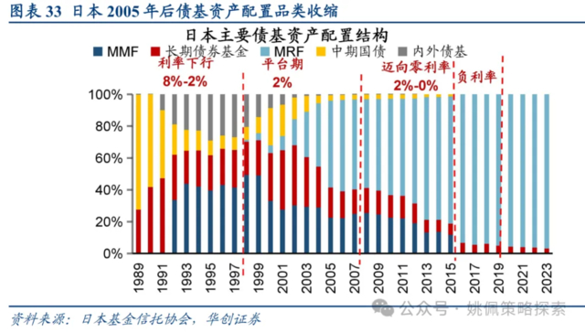 日本公募:泡沫大破裂结束后、利率平台期股票基金占比回升,债券&MMF降。日本公募基金规模在2012年后,随着日本经济恢复和股市回暖,规模呈现明显扩张,占GDP比例从15%持续上升至30%以上。公募产品规模分布与资产价格走势呈现出一定的相关性。1990年股市泡沫破裂后的利率下行期,股票市场也进入漫长下跌期,股票型基金规模占比持续下降、而债券&MMF(货币管理基金)类基金占比上升;利率降至2%平台期后,随着亚洲金融危机冲击逐步消退,2003年日本经济呈现回暖迹象,金融机构和地产行业出清基本完成,股票类基金占比再度大幅上升至80%左右水平,达到甚至超过90年初高点;债券类基金占比则降至20%以下,MMF逐步退出历史舞台。股票型基金投向来看,海外投资是低利率时代的重要方向,2014年占比近半(考虑到国际投资中也包含部分海外资产,实际海外投资占比可能更高),其中又以海外债券占比最高,达到61%;此后随着日本国内市场回暖,海外投资占比降至20%左右,而国内投资占比从30%逐步升至50%左右,股基海外投资中,股票也成为主要投资品种。债基内部来看,90年代随着其规模大幅扩张,在主要公募产品中占比接近80%,内部品类也趋于丰富,内外债基、MMF规模扩张明显;但利率2%平台期随着债基整体市场萎缩,品类持续收缩,最终留存的主要是MRF(货币储备基金,与投资行为关联密切)和长期债券基金,其中又以MRF为主。