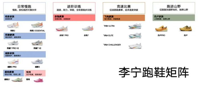 围绕运动科技应用,李宁着手打造在三个维度的能力:运动品类扩容力、品类产品矩阵化以及产品系列迭代。