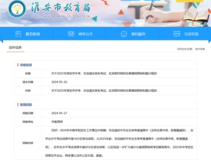 此前,有网友在淮安市教育局网站“互动交流”栏目网站相关版块提问:关于2025年淮安市中考,非应届生报名考试,在录取时候的志愿填报限制和赋分规则。5月27日,淮安市教育局答复称,2024年中等学校招生工作意见中明确:非应届初中毕业生报考普通高中(含综合高中班、职普融通班),在学业水平考试成绩中减10分后参加录取。
