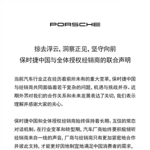 5月27日晚,保时捷中国与全体授权经销商发布联合声明,称保时捷中国与经销商共同面临若干复杂问题,机遇与挑战并存。