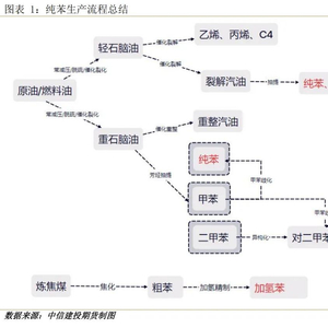 纯苯是一种化学物质,常温下为无色透明液体,易燃有毒具有芳香味,属于易燃液体危化品。目前世界上生产纯苯主要有催化重整、裂解汽油、甲苯歧化、甲苯加氢脱烷基化(HDA)以及从焦碳炉轻油和煤焦油中得到苯。纯苯在上述生产路径中大多处于副产物地位,企业可以根据性价比及市场需求等外采部分原料及中间品(例如重石脑油、粗苯等)进行芳烃的增产。