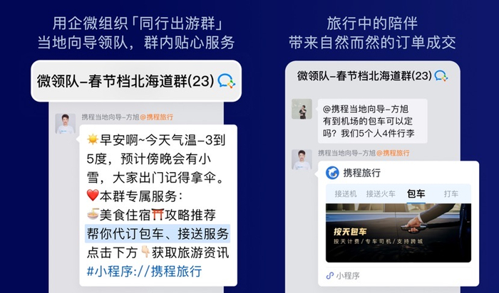很多新需求,就隐藏在“聊天”中。携程集团数字营销部的王绩强介绍,企业微信就是一个很好的渠道,携程用企业微信和用户加上好友之后,就打开了一个全新的“切口”,有机会进一步地去聊出用户需求,帮他定制旅游全套行程、种草旅行路线、促进顾客复购等。