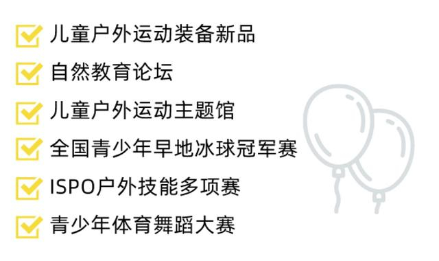 多家儿童户外运动装备品牌现场新品放送;自然教育论坛,探索儿童运动户外与自然教育的跨界融合。作为儿童友好展会,ISPO欢迎亲子家庭观展,试装备,体验和学习水上运动、马术、射箭、滑板、匹克球、骑行等运动。现场将首次打造超1000平米儿童户外运动主题馆,汇聚儿童运动户外夏令营机构、自然教育机构,儿童户外技能知识分享和互动学习等。