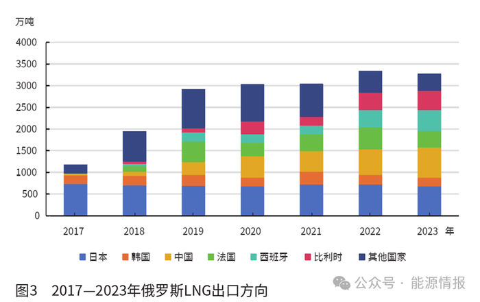 继2014年克里米亚事件之后,2022年初爆发的乌克兰危机进一步也重塑了俄罗斯的地缘政治格局,受到西方战略挤压的俄罗斯不得不选择“向东看”。中国是仅次于美国的世界第二大经济体,同时也是世界最大的能源消费国。随着“一带一路”倡议的不断深入推进,中俄全面战略协作伙伴关系不断开创新局面,中俄关系处于历史最好时期。中俄除了提升管道气合作之外,LNG的贸易量也不断增长,2023年,俄罗斯向中国出口约800万吨LNG,同比增长23%,俄罗斯成为中国第三大LNG供应国,占中国LNG总进口量的12%,同时中国已经成为俄罗斯LNG的最大进口国。2017—2023年俄罗斯LNG出口方向见图3。