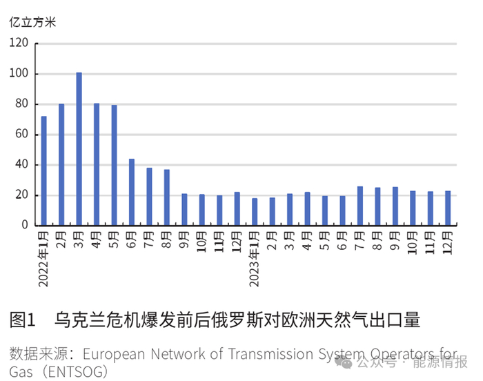 2023年,俄罗斯共出口天然气约1420亿立方米,比2021年的2440亿立方米减少了42%,其中包括向欧洲、独联体国家和中国输送约990亿立方米的管道天然气,以及向其他地区出口约440亿立方米的LNG。2022年乌克兰危机爆发后,在俄罗斯控制对欧天然气出口和欧洲摆脱对俄天然气依赖的双重作用下,俄罗斯对欧洲的管道出口量从2021年的1400亿立方米跌至2022年的630亿立方米,2023年仅约为270亿立方米(见图1)。相比之下,俄罗斯对中国和独联体国家的天然气出口量一直在上升。中俄东线管道供应量从2021年的100亿立方米增加到2023年的227亿立方米,计划到2025年达到380亿立方米。