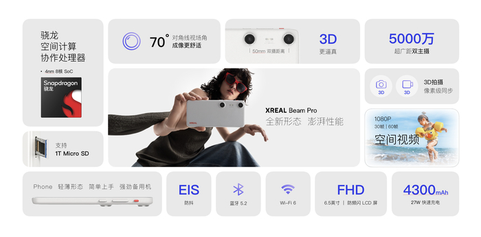 Beam Pro整机大小重量与手机无异,正面搭载一块6.5英寸防频闪LCD屏幕,背面拥有两颗5000万像素摄像头的空间影像模组,底部设置了双USB-C接口,在连接AR眼镜的同时可以实现边充边用,侧面设置了物理按键,能够实现3DoF悬停/云台防抖的一键切换。