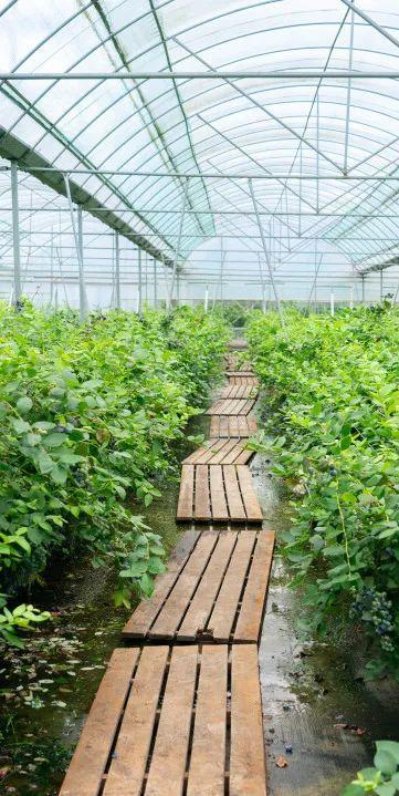 有别于往年的露天种植,今年园区内有6亩区域为设施大棚种植,市民可以体验品尝温室种植的蓝莓鲜果。在这些高大的连栋大棚内,采用基质盆栽的蓝莓植株在全自动水肥一体化滴灌系统的悉心照料下茁壮成长。精准水肥供应、环境控制和基质栽培,可以有效降低生产成本;渗出液回收循环再利用,则可以减少化学肥料的使用,从而避免对土壤和水源的污染。