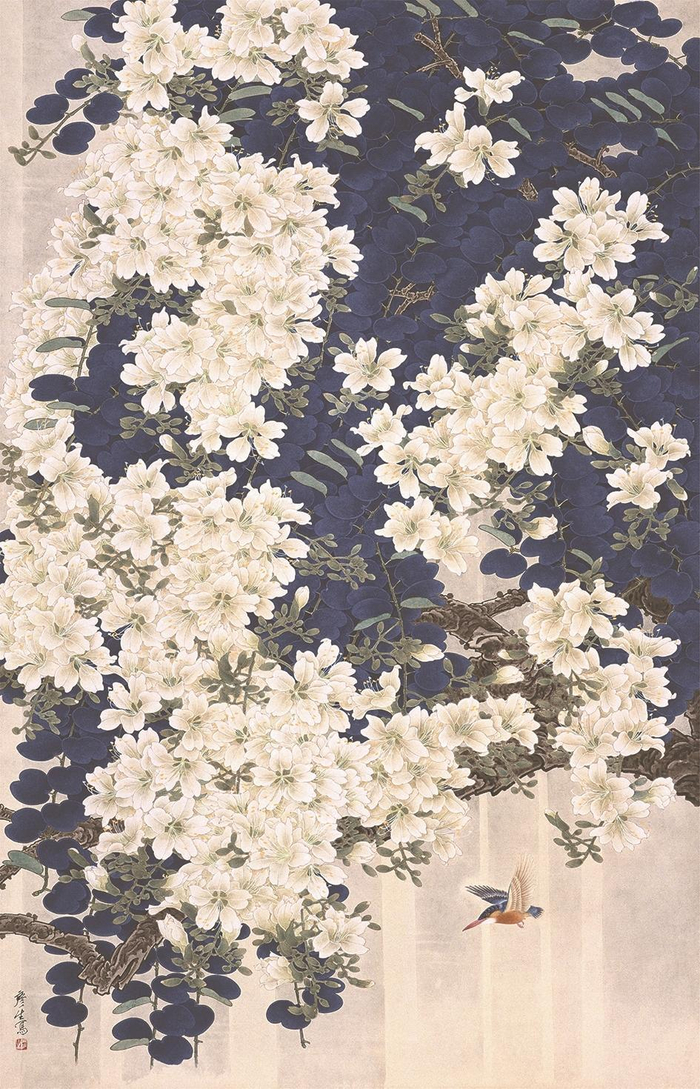 于非闇的《玉兰黄鹂》以中国传统工笔花鸟画技巧展现了玉兰的玉树临风与黄鹂的熠耀其羽。画中的黄鹂,或静坐枝头,或振翅高飞,与洁白的玉兰花形成动静结合的美景,象征着春天的清新与活力。