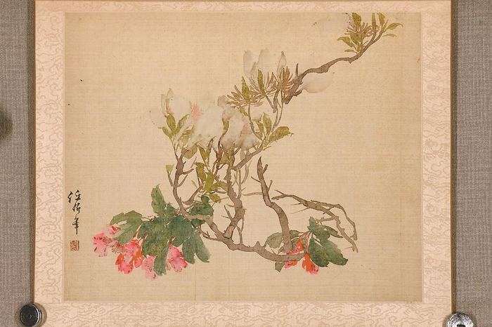 任伯年的《玉兰海棠》采用了没骨画技法,以直接的色彩表现物象,展示了玉兰与海棠的柔美交织,如同春雨后新鲜绽放的花朵,生动感人。