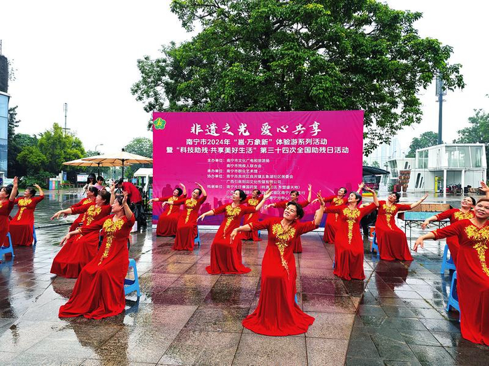 此次活动还创新打造“非遗+生活”新场景,现场设置有传统扎染、绣球制作等非遗手工作坊,抛绣球、套圈、蒙眼敲锣等民族竞技活动,还有非遗工艺品、非遗美食展示和瑶医眼疾疗法、滕氏龙脊灸等传统医药公益体验及非遗市集……内容丰富、形式多样的非遗体验活动,让现场的残疾人朋友沉浸式体会中华传统文化魅力,感受非遗之美,共享美好生活。