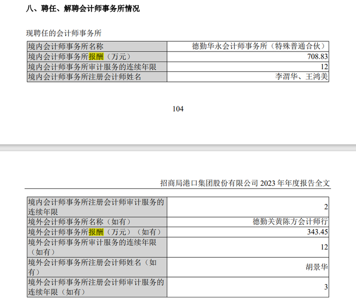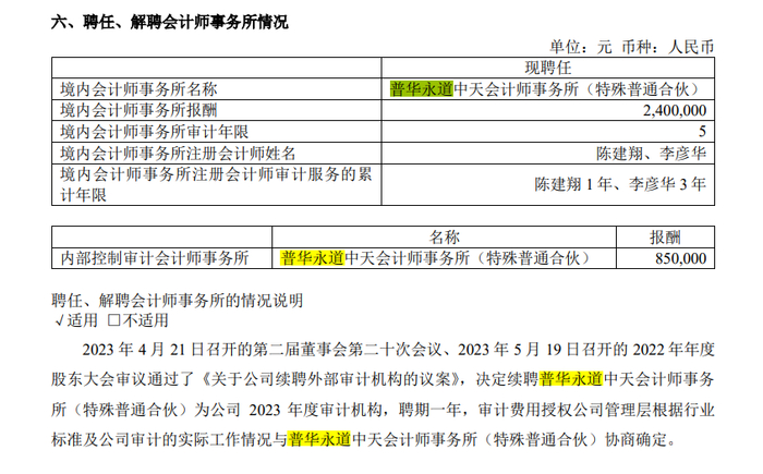 经 2022 年年度股东大会批准,本公司继续聘任普华永道中天会计师事务所(特殊普通合伙)及罗兵咸永道会计师事务所分别为本公司 2023 年度之境内及境外审计师(核数师)。2023 年度审计项目合伙人赵娟女士,为本公司提供审计服务三年;签字注册会计师胡洋先生,为本公司提供审计服务三年。审计工作酬金为人民币 0.46 亿元,主要是为境内外所需提供相关审计服务,其中财务报告审计费用为人民币 0.39 亿元,财务报告内部控制审计费用为人民币 0.07 亿元。关于审计师酬金详细情况请参阅本年度报告内按照国际财务报告会计准则编制的财务报表附注 7。