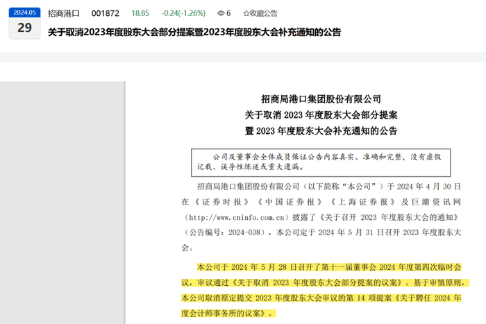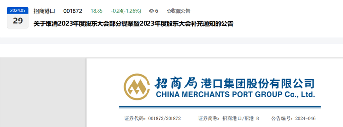 3、2024-05-29招商港口:关于取消2023年度股东大会部分提案暨2023年度股东大会补充通知的公告