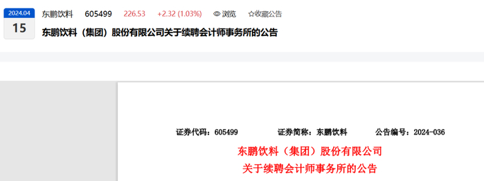 ●东鹏饮料(集团)股份有限公司 (以下简称 “公司”)于2024年4月12日召开第三届董事会第四次会议和第三届监事会第四次会议,分别审议通过了《关于续聘会计师事务所的议案》,公司董事会提议续聘普华永道中天会计师事务所(特殊普通合伙)为2024年度公司财务报告和内部控制审计机构,该事项尚需提交2023年年度股东大会审议。