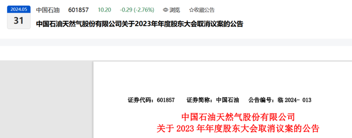 1、2024-05-31中国石油:中国石油天然气股份有限公司关于2023年年度股东大会取消议案的公告