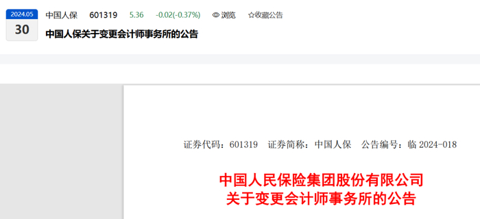 2、2024-05-30中国人保601319: 中国人保关于变更会计师事务所的公告