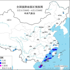 预计,5月31日08时至6月1日08时,浙江西北部和南部、安徽南部、福建北部和西部、江西东南部、广东、海南岛、云南南部以及西藏东南部等地部分地区有大到暴雨,其中,福建北部、广东东部沿海、海南岛东部和西南部等地局地有大暴雨(100~140毫米)。上述部分地区伴有短时强降水(最大小时降雨量20~50毫米,局地可超过70毫米),局地有雷暴大风等强对流天气(见图1)。中央气象台5月31日06时发布暴雨蓝色预警。