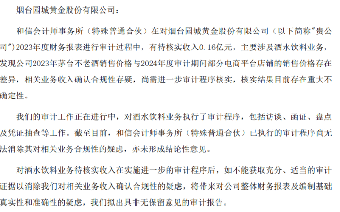 时间来到2024年4月23日,园城黄金披露的《年审会计师告知函》又引发了关注。和信会计师事务所表示,园城黄金有待核实收入0.16亿元,主要涉及酒水饮料业务,发现园城黄金2023年茅台不老酒销售价格与2024年度审计期间部分电商平台店铺的销售价格存在差异,相关业务收入确认合规性存疑,尚需进一步审计程序核实,核实结果目前存在重大不确定性。2024年4月30日,园城黄金被审计机构出具了无法表示意见的审计报告,这无疑成为了压倒骆驼的最后一根稻草。