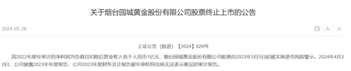2024年5月28日傍晚,上交所发布了一则公告,宣告了烟台园城黄金股份有限公司(*ST园城)股票上市的终止。