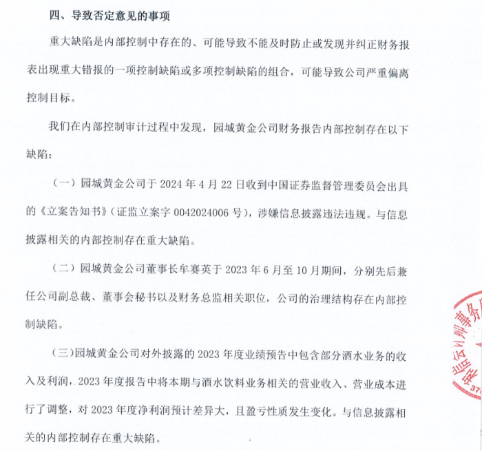 根据中国证券监督管理委员会出具的《立案告知书》(证监立案字 0042024006号),园城黄金涉嫌信息披露违法违规;园城黄金董事长牟赛英于2023年6月至10月期间,分别先后兼任公司副总裁、董事会秘书以及财务总监相关职位,公司的治理结构存在内部控制缺陷;园城黄金2023年度报告中将本期与酒水饮料业务相关的营业收入、营业成本进行了调整,对2023年度净利润预计差异大,且盈亏性质发生变化。与信息披露相关的内部控制存在重大缺陷。