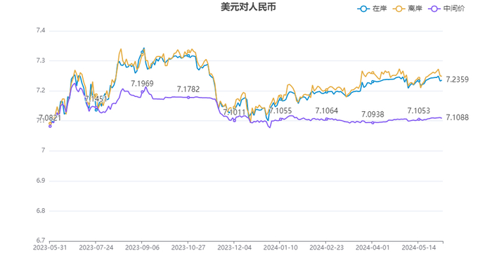 具体数据显示,“五一”假期期间,离岸人民币兑美元一度涨至2月以来最高点7.1644,累计涨幅接近700个基点,录得年内最大周度涨幅;但在5月30日,离岸人民币盘中失守7.27至六周新低,最低跌至7.2745。在岸人民币兑美元整体于7.20-7.25区间波动,最高升至7.2050,最低跌至7.2497。