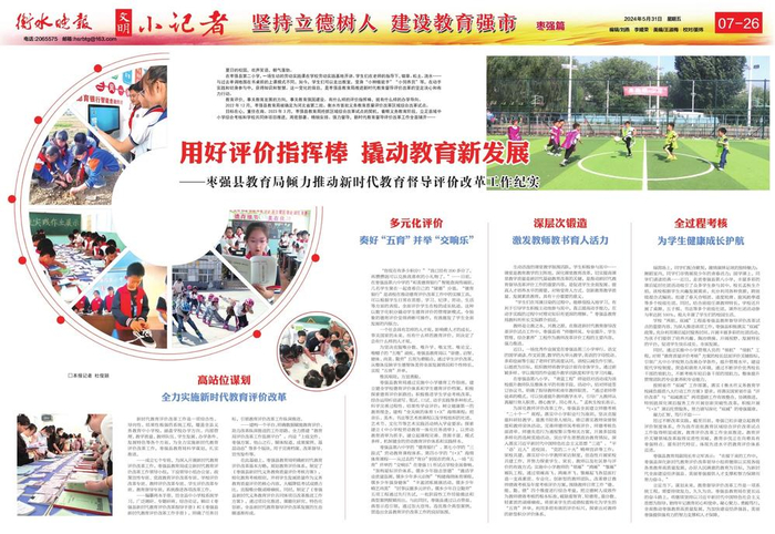 枣强县第六中学的“德育银行”、第七小学的“三段式”劳动教育课程体系、第四小学的“1+X”海绵体育课程……从过去的“育分”到现在的育人,一场“五育”并举的“交响乐”在枣强11所试点学校全面奏响。“架构星标评价体系,儒乡少年励志崇德”“激活学业质量监测,儒乡少年多元启智”“构建海绵体育课程,儒乡少年强身健体”“丰盈团练展演活动,儒乡少年精艺尚美”“时事议题多元评价,儒乡少年自立勤劳”五项工程通过先行先试,一批阶段性工作经验做法和典型案例脱颖而出。与此同时,枣强县通过以点带面、典型示范引领,通过加大宣传,选优推介典型案例,营造出全县教育评价改革工作的良好氛围。