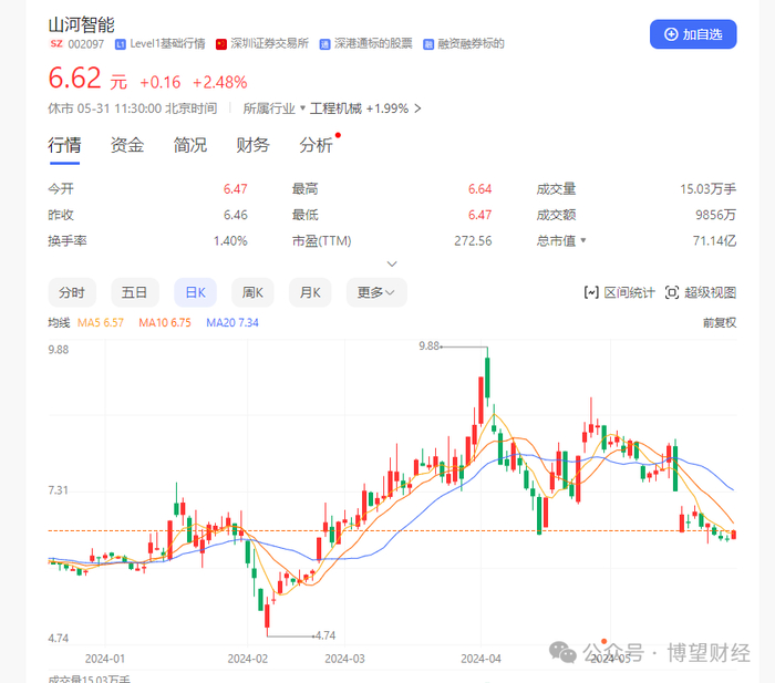 问询函一经发出,市场对此反映强烈,当天午后开盘后直接跌停,此后这一周也陷入了阴跌状态,截止5月31日午间收盘,山河智能股价收于6.62元/股,距离此前最高价9.88元/股,已经下跌了33%。