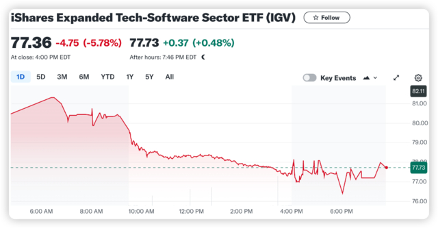 Salesforce的困境反映出整个软件行业的共同挑战。十家最大的软件公司中,有八家公司在发布最新业绩后股价应声下跌,跌幅平均达9%。隔夜iShares软件ETF(IGV)暴跌近6%。