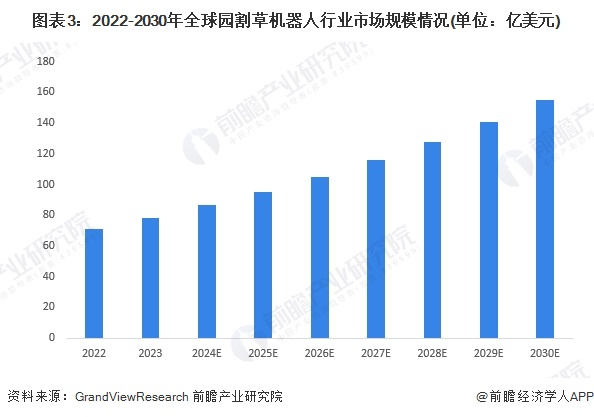 割草机器人作为园艺机具智能化发展的一个重要方向,其市场正在迅速增长。根据GrandViewResearch公布的数据,2022年年全球割草机器人行业市场规模约为71.2亿美元,预计2023年至2030年将以10.9%的复合年增长率增长,预计2030年全球割草机器人市场规模超过150亿美元。