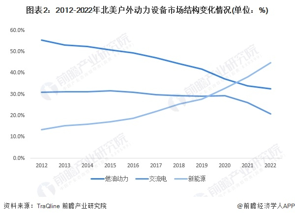 近年来,随着全球变暖和环境污染的加剧,世界各国对环保问题日益重视,各国环保法律法规对园林机械产品的要求也逐步提高,如欧盟的欧II排放标准、美国的EPA标准等,园林机械产品面临更高的环保要求。传统的以燃油动力驱动的园林机械产品,能源利用率较低,热能损失严重,且由于缺乏尾气处理装置所产生的尾气对大气会造成严重污染。相较于传统燃油动力园林机械产品,基于锂电动力的新能源园林机械产品具有清洁环保、噪声小、振动小、维护简单、运行成本低等优良产品特性;随着锂电池技术不断取得进展,电池续航和制造成本限制逐渐被突破,新能源园林机械产品开始普及市场并取得各类终端用户认可,其市场占有率也在产业技术升级趋势引领下逐年递增。根据TraQline统计数据,在北美地区的户外动力设备(OPE,Outdoor Power Equipment)领域,燃油动力园林机械市场份额已由2012年的55.4%下滑至2022年的32.8%,而新能源园林机械市场份额则由13.4%快速增长至44.9%。随着电动机技术对内燃机技术的逐步超越,新能源园林机械的优势更加明显,预计未来在除林场伐木、市政环卫等专业领域外的一般家用、商用领域,燃油动力园林机械市场份额将持续下降,新能源园林机械对燃油动力园林机械具有很强的替代性。