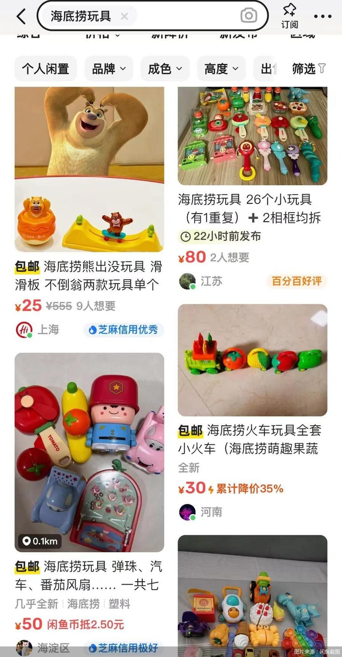 北京商报记者在社交媒体上看到,也有不少关于倒卖海底捞玩具的帖子出现其中,有的是全新带包装,有的则是二手,大多价格在十几元至八十元之间,而这些玩具大多是消费者在门店免费获取的。上文中提到的而海底捞的新规,增加了非儿童顾客获取玩具的门槛,或许会从一定程度上减少在门店薅羊毛到二级市场转卖的情况。