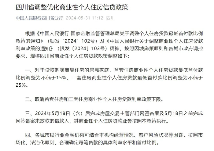 今天上午,中国人民银行四川省分行发布了《四川省调整优化商业性个人住房信贷政策》的通知,确定了下调个人住房贷款最低首付款比例和取消了贷款利率下限。