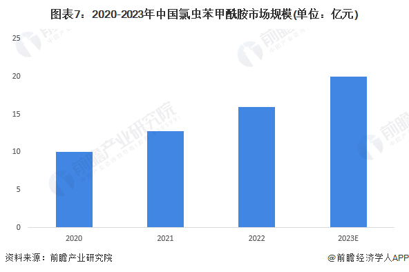 随着氯虫苯甲酰胺本土化生产以及产能持续释放,氯虫苯甲酰胺产品价格呈现出下降趋势。2023年,国内氯虫苯甲酰胺市场规模在20亿元左右。