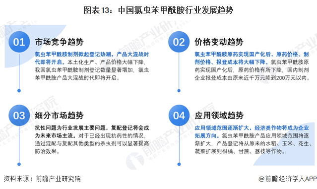 在竞争层面,本土化生产、产品价格大幅下降,我国氯虫苯甲酰胺制剂登记数量显著增加,氯虫苯甲酰胺产品大混战时代即将开启;在价格层面,氯虫苯甲酰胺原药实现国产化后,原药价格有所下降,国内制剂企业报登成本由原来近千万元降到200万元以内;在细分层面,抗性问题为行业发展主要问题,复配登记将会成为未来市场主流;在应用层面,氯虫苯甲酰胺应用领域范围将逐渐扩大,经济类作物将成为企业拓展方向。