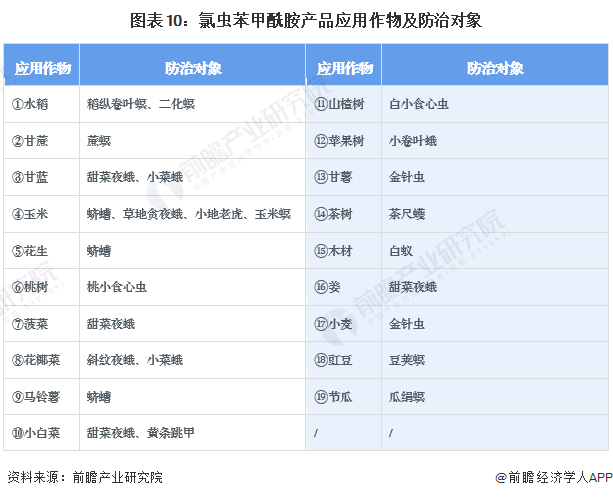 氯虫苯甲酰胺对鳞翅目害虫有特效,也能防治鞘翅木甲虫,半翅目粉虱和双翅目潜蝇等害虫且在低剂量下就有可靠和稳定的防效,能够很好的保护作物不受药害影响,可应用于水稻、甘蔗、甘蓝、玉米、花生、桃树、菠菜、花椰菜、马铃薯、小白菜、山楂树、苹果树、甘薯、茶树、木材、姜、小麦、豇豆、节瓜等多种作物,常用于防治稻纵卷叶螟、蔗螟、甜菜夜蛾、二化螟、小菜蛾、蛴螬、桃小食心虫、白蚁、草地贪夜蛾、玉米螟、豆荚螟、金针虫、梨小食心虫、蔗龟、斜纹夜蛾、黄条跳甲、茶尺蠖、稻水象甲、白小食心虫、瓜绢螟、小地老虎、小卷叶蛾等多种害虫。