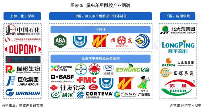 从产业链主要参与企业来看,氯虫苯甲酰胺上游主要为化工原料,上游企业数量众多,主要代表性企业有中国石化、宁波金海晨光化学股份有限公司等;氯虫苯甲酰胺中间体主要企业有雅本化学、友道化学、辉隆瑞美、恒友化工、善水科技等;氯虫苯甲酰胺原药和制剂国外生产企业主要有富美实、先正达、住友化学等,国内主要生产企业有红太阳、山东亿盛、广信股份、广西田园生化股份有限公司等。下游主要为农业企业,我国农业参与者范围较广,除企业外还有大量个体经营户或集体经营户,主要代表企业有北大荒、隆平高科、大北农、宏辉果蔬等。