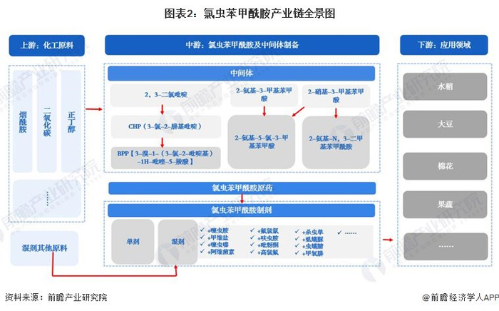 从产业链结构看,氯虫苯甲酰胺产业上游为石油化工原料,主要包括烟酰胺、二氧化碳、正丁醇等,此外,还包括氯虫苯甲酰胺混剂的其他原料等,中游主要包括氯虫苯甲酰胺中间体、氯虫苯甲酰胺原药、氯虫苯甲酰胺制剂等。氯虫苯甲酰胺初级中间体主要包括2,3-二氯吡啶、3-氯-2-肼基吡啶、2-氨基-3-甲基苯甲酸、2-硝基-3-甲基苯甲酸,高级中间体主要包括3-溴-1-(3-氯-2-吡啶基)-1H-吡唑-5-羧酸、2-氨基-5-氯-3-甲基苯甲酸、2-氨基-N,3-二甲基苯甲酰胺等。氯虫苯甲酰胺制剂包括单剂与混剂,如氯虫苯甲酰胺+噻虫胺、氯虫苯甲酰胺+甲维盐、氯虫苯甲酰胺+噻虫嗪、氯虫苯甲酰胺+阿维菌素等多种类型。下游主要应用领域主要为水稻、大豆、棉花、果蔬等农作物生产。