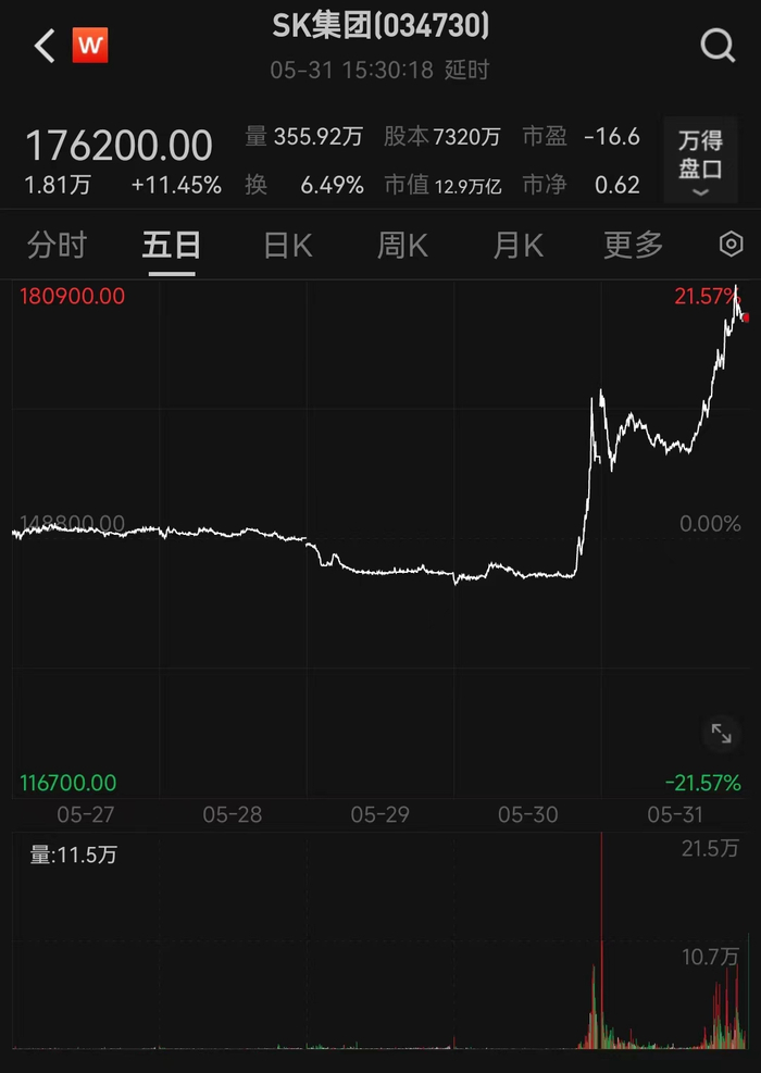 近日,韩国股市迎来罕见一幕,SK集团股价在周四收盘前异常上涨超过16%,创下近四年来的单日最高涨幅,周五继续攀升,截至收盘涨涨幅%,176200韩元/股,总市值12.9万亿韩元。此番股价异动背后,竟是与一场引人注目的离婚财产分割案紧密相关。