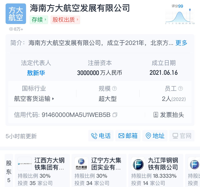 方大航空全称为海南方大航空发展有限公司,是辽宁方大集团参与海航航空主业破产重整的投资主体。从股权关系来看,天眼查APP显示,方大航空成立于2021年6月16日,由辽宁方大集团作为牵头主体、联合其多家下属企业江西方大钢铁、九江萍钢等共同设立而成。
