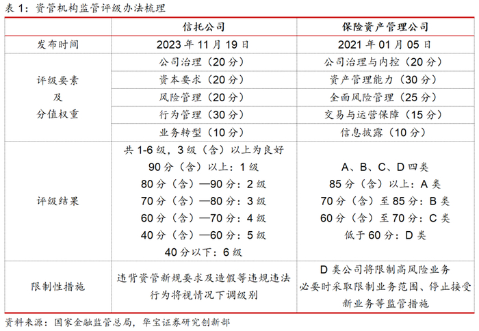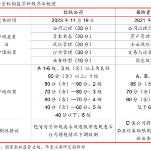 5月24日,监管部门就银行理财公司评级办法向行业内征求意见,核心导向 为“质量重于规模”。从目前媒体报道的内容看,对理财公司评级办法的细节信息披露较少,但从监管的角度看,考虑到理财公司作为资管机构,与信托公司和保险资管公司一同受国家金融监管总局资管机构监管司的监督管理,评级办法可能参考信托和保险资管的做法,采取分类监管的模式。即根据监管评级结果,对不同评级类别的理财公司在市场准入、监管措施及监管资源配置等方面实施区别对待的监管政策。在评级办法中除核心指标及权重设置外,通过调整项设置加分项及扣分项,对获得高评级机构给予一定的激励,如可优先试点创新业务。评级办法的出台或将推动理财公司在业务模式、产品创新和服务质量等方面的不断提升。