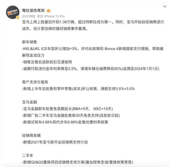 为了求证这个消息的真实性,有媒体特意联系了上海宝马4S店的销售人员。对方表示,最近宝马i3确实在做增量,所以优惠力度特别大,裸车价在19万左右,除了电动车之外,宝马新5系油车也有促销活动,最大优惠力度达到11万元。另外,多家4S店都透露了类似的信息,宝马i3的折扣基本可以打到6折左右,性价比令人吃惊!