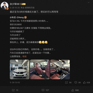 有博主爆料表示,宝马i3 35L的价格变动可是按小时来算的。原价353900元的车,现在优惠完裸车价只要189,567元。还只需要交交强险,连商业保险都不用买了,这可真是省了一大笔钱。