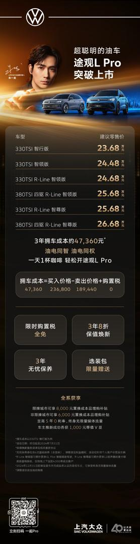 5月30日,途观L Pro正式上市,推出6款车型,建议零售价为23.68万-26.68万元。本次上汽大众途观L Pro上市即响亮打出了“拥车成本”的概念,叠加给力的限时购置税全免、3年8折保值焕新、3年无忧保养以及选装包限量赠送等权益,途观L Pro三年拥车成本仅需47360元起。