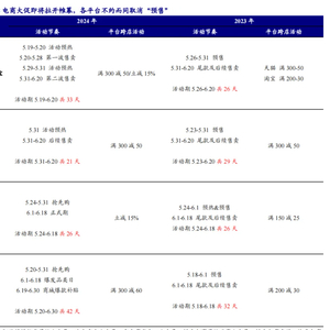 活动机制方面,开源证券分析称,2024年四大电商平台均无预售环节,一方面简化流程让大促活动对消费者更加友好,有望提升消费者体验、促进消费,但另一方面也对商家运营能力提出较大考验。