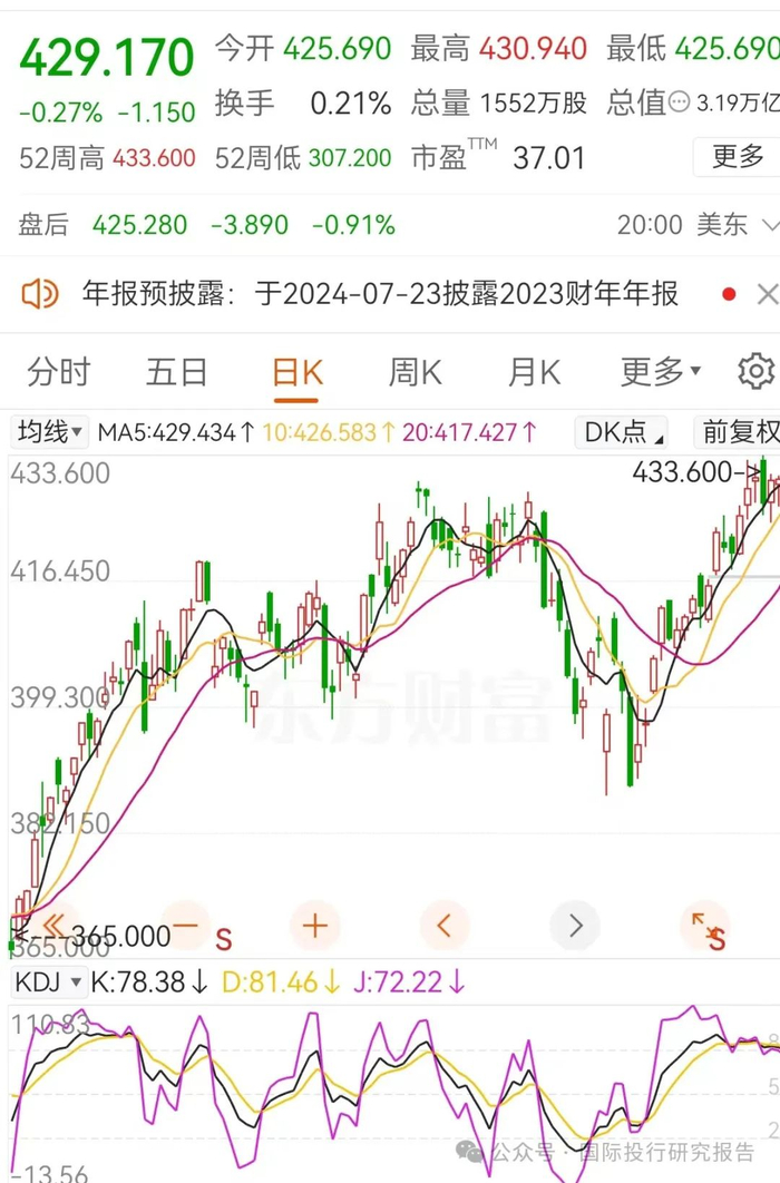 3月4日414.17美元,昨天收盘429.17美元