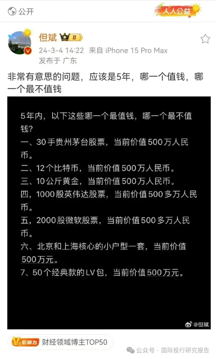今年3月4日,但斌曾经发过一条微博,就是未来5年如果有茅台比特币英伟达黄金房子LV几个选择,哪个会赚钱?现在过去快3个月了,看了一下,只有豪赌英伟达能赢!