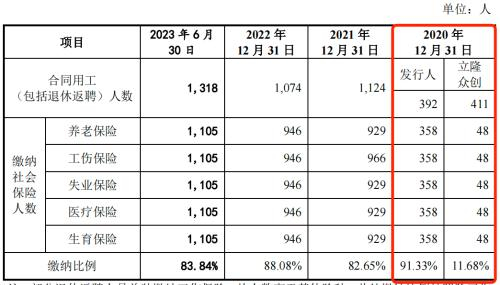不仅如此,2020年,立隆众创共拥有411名合同用工,其中社会保险的缴纳比例仅有11.68%,公积金甚至无人缴纳。此外。2021年,利安科技公积金存缴比例也只有66.64%。