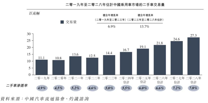 汽车街招股书提到,与美国等发达国家市场相比,中国的二手车渗透率较低,这表明市场仍有巨大的发展潜力。2023年,中国二手乘用车总交易量达到1,441.7万辆,二手车渗透率仅为5%。随着政策法规支持、跨区域交易增加、社交媒体渠道发展和技术进步的推动,中国二手车市场有望快速发展,预计2028年中国二手乘用车总交易量将达到2,733.8万辆,2023年至2028年的期间复合增长率为13.7%,预计二手车渗透率也将增长至7.8%。
